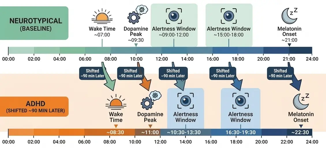 This delay has a direct chemical cause: melatonin. In most adults, melatonin — the hormone that signals sleepiness — begins rising in the early evening. In adults with ADHD, that onset is delayed by an average of 90 minutes. Your body simply isn't ready for sleep when society says it should be. While everyone else is winding down at 10PM, your brain is just warming up.